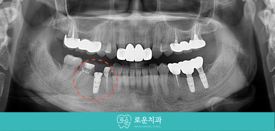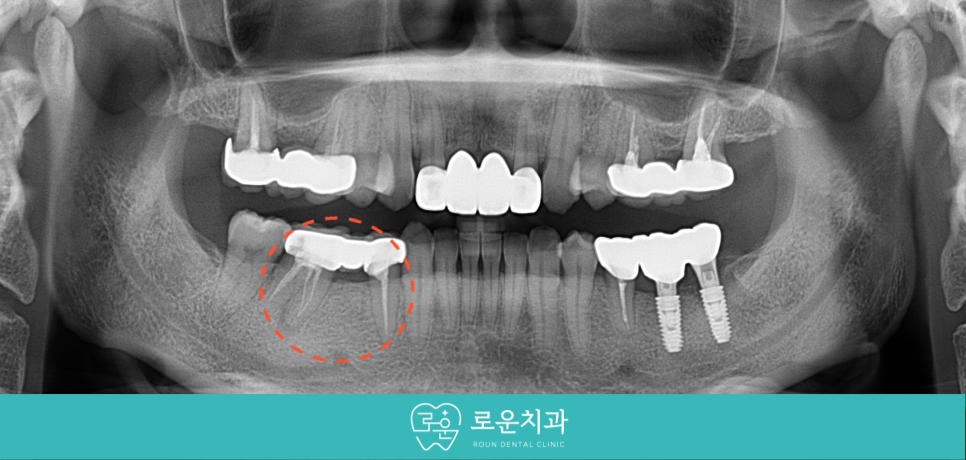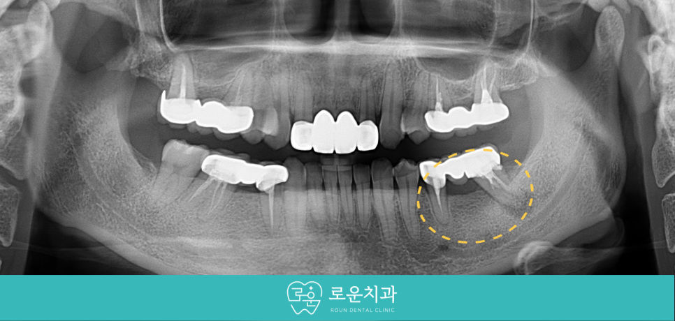 아래턱 왼쪽 아래 과거 보철물을 수복했던 부위에서